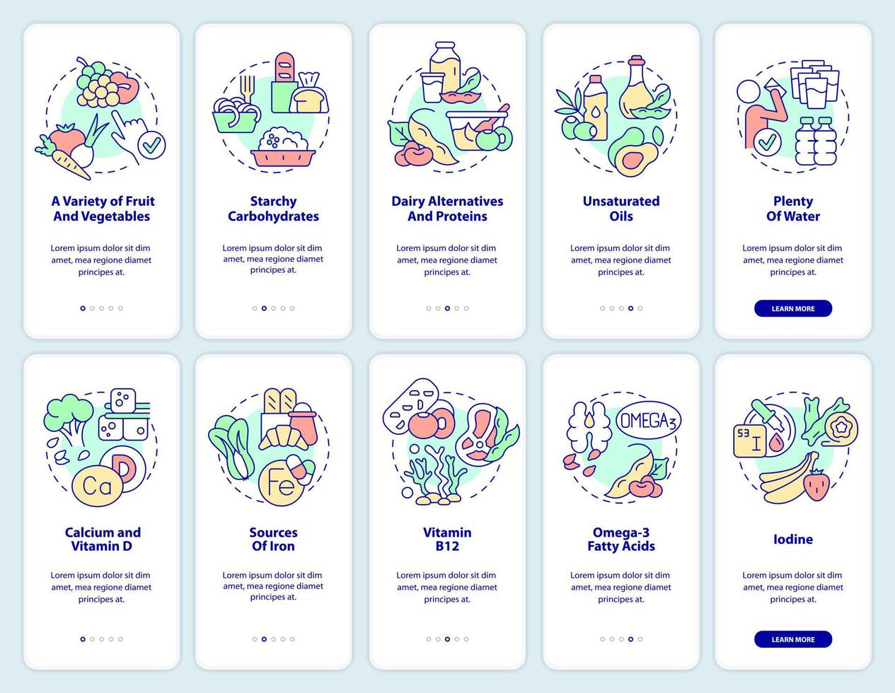conjunto de pantalla de aplicación móvil de incorporación de estilo de vida vegano. tutorial de veganismo saludable 5 pasos páginas de instrucciones gráficas con conceptos lineales. interfaz de usuario, ux, plantilla de interfaz gráfica de usuario. Vector Pro