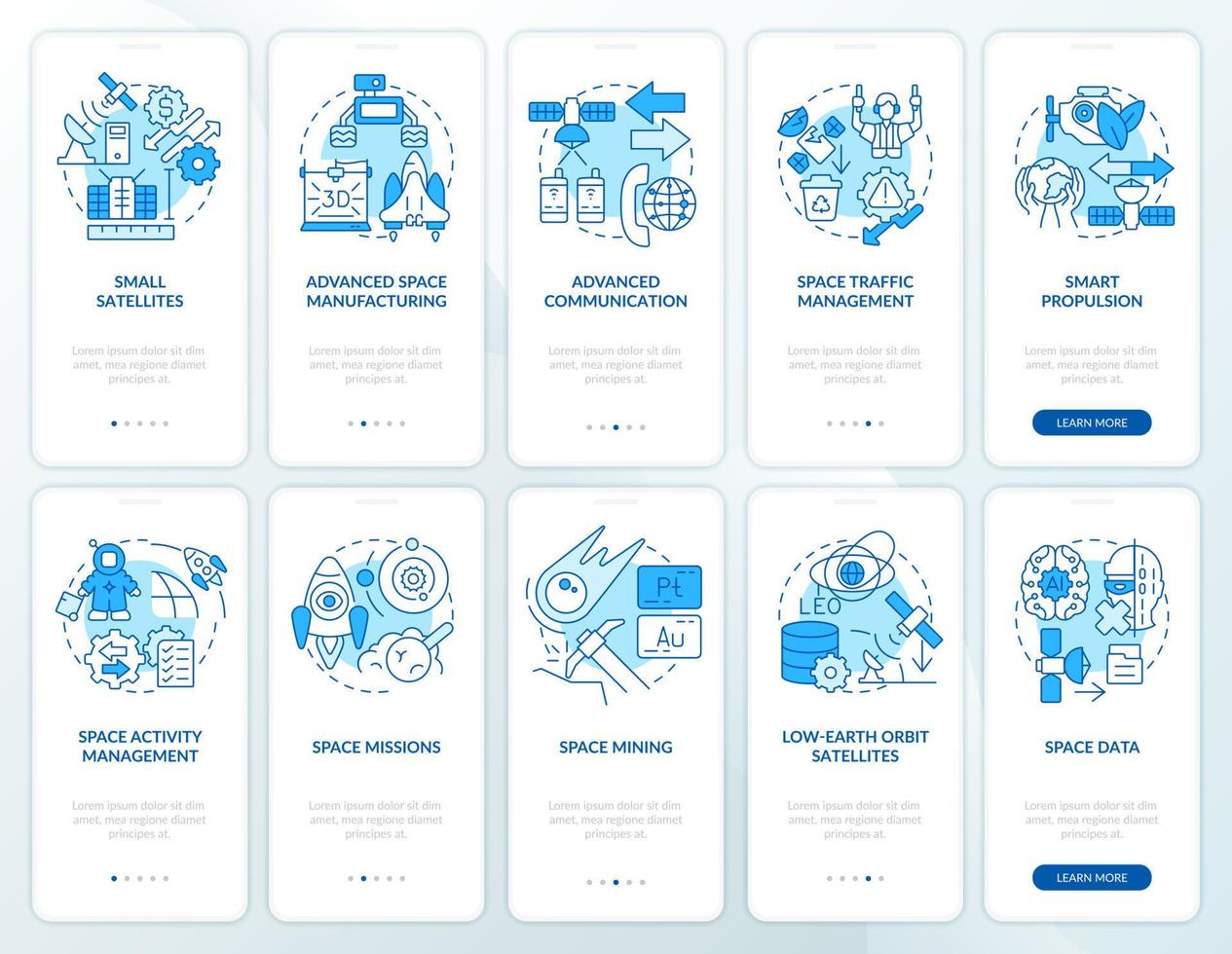 juego de pantalla de aplicación móvil de incorporación de tecnología azul de exploración espacial. cosmos tutorial 5 pasos páginas de instrucciones gráficas con conceptos lineales. interfaz de usuario, ux, plantilla de interfaz gráfica de usuario. Vector Pro