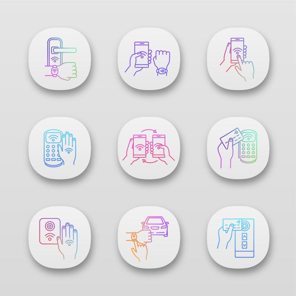conjunto de iconos de aplicaciones de tecnología nfc. pulsera nfc, cerradura de puerta, transferencia de datos, teléfono inteligente, automóvil. Cerca de un campo de comunicación. interfaz de usuario ui ux. aplicaciones web o móviles. Ilustraciones de vectores aislados Vector Pro