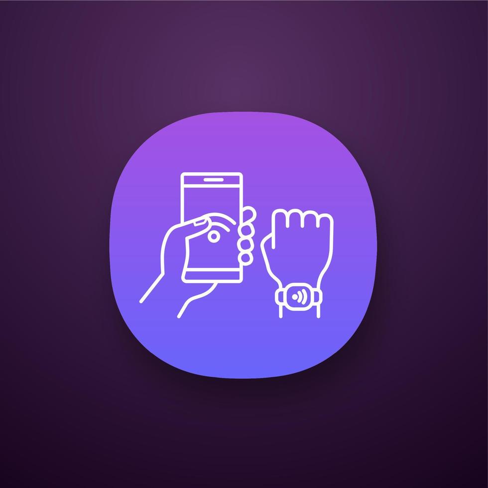 pulsera nfc conectada al icono de la aplicación del teléfono inteligente. teléfono nfc con reloj inteligente. Cerca de un campo de comunicación. pulsera rfid. interfaz de usuario ui ux. aplicación web o móvil. ilustración vectorial aislada Vector Pro