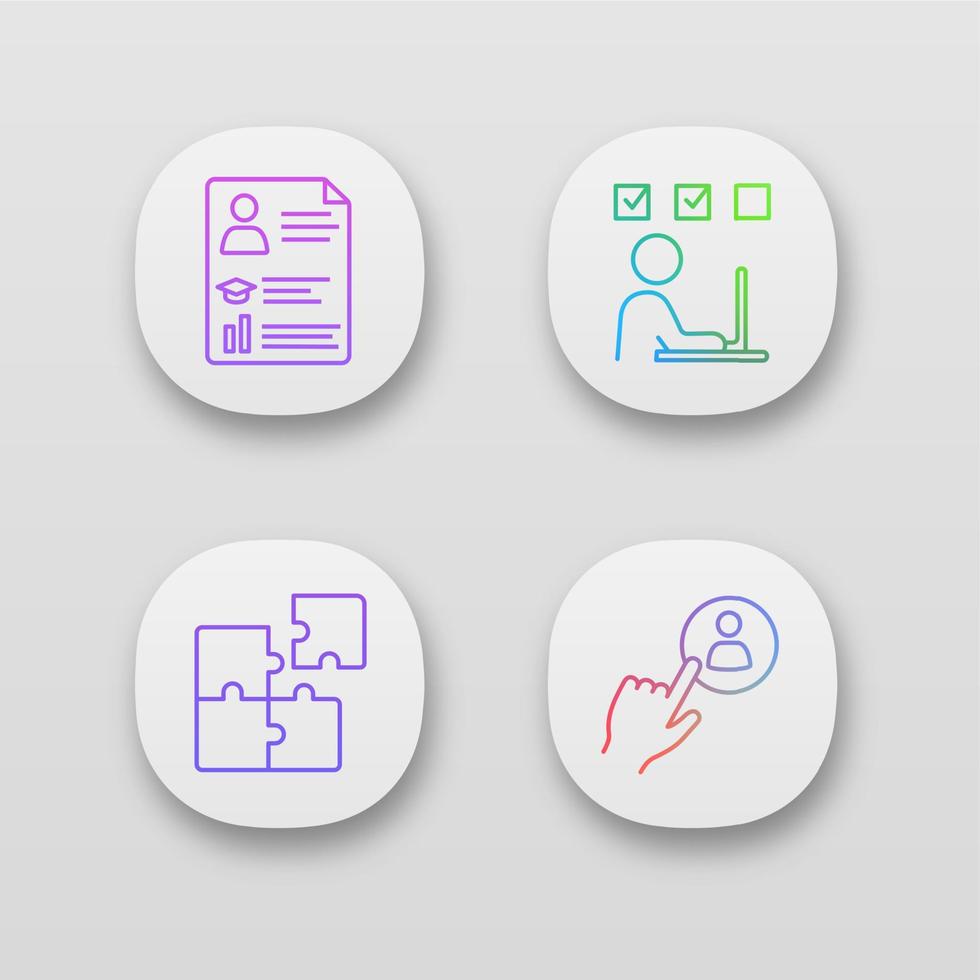 conjunto de iconos de aplicaciones de gestión empresarial. currículum, capacitación en línea, búsqueda de soluciones, botón de contratación de personal. interfaz de usuario ui ux. aplicaciones web o móviles. Ilustraciones de vectores aislados Vector Pro