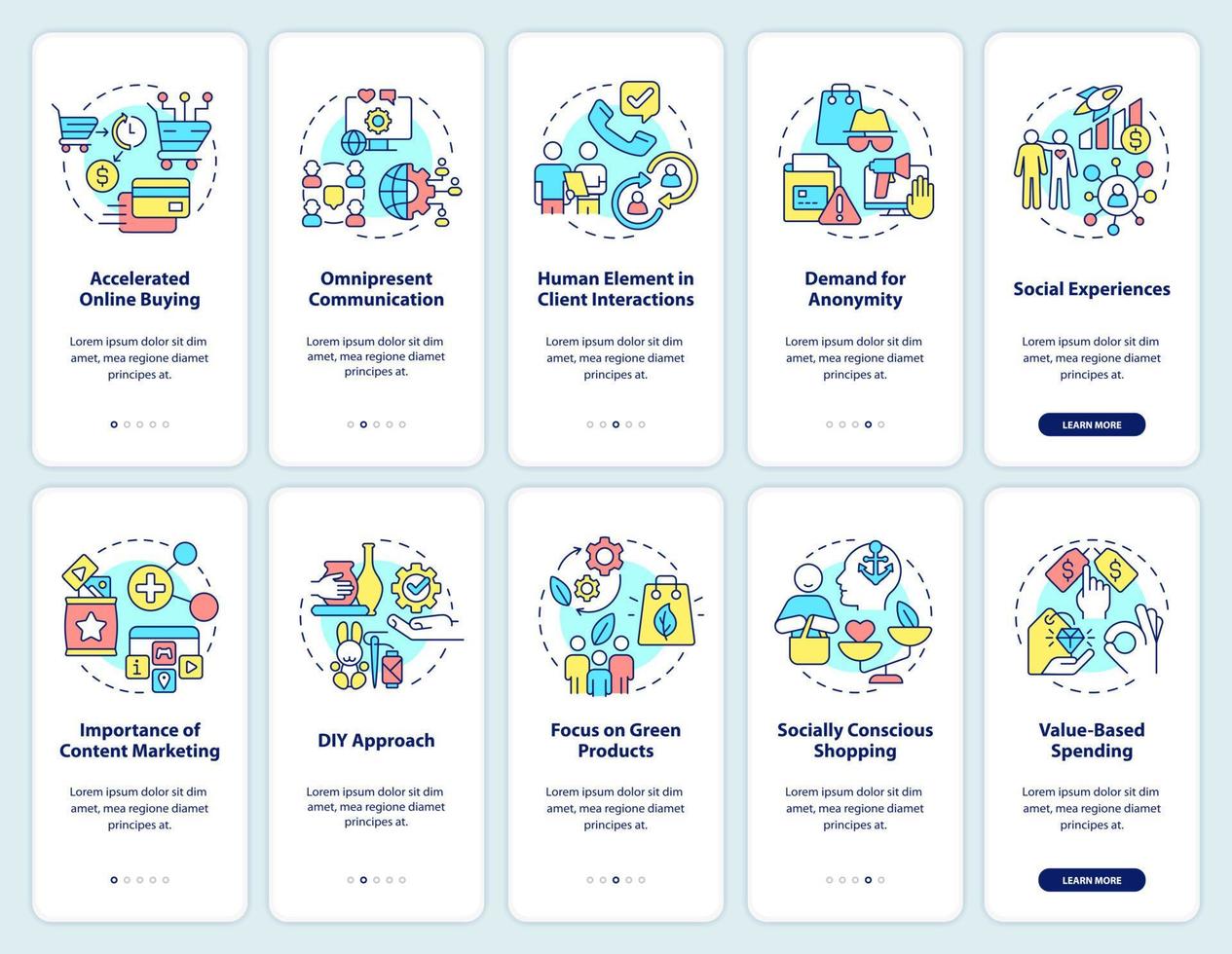 el cliente necesita incorporar el conjunto de pantalla de la aplicación móvil. tutorial de tendencias de comportamiento de los clientes páginas de instrucciones gráficas de 5 pasos con conceptos lineales. interfaz de usuario, ux, plantilla de interfaz gráfica de usuario. Vector Pro