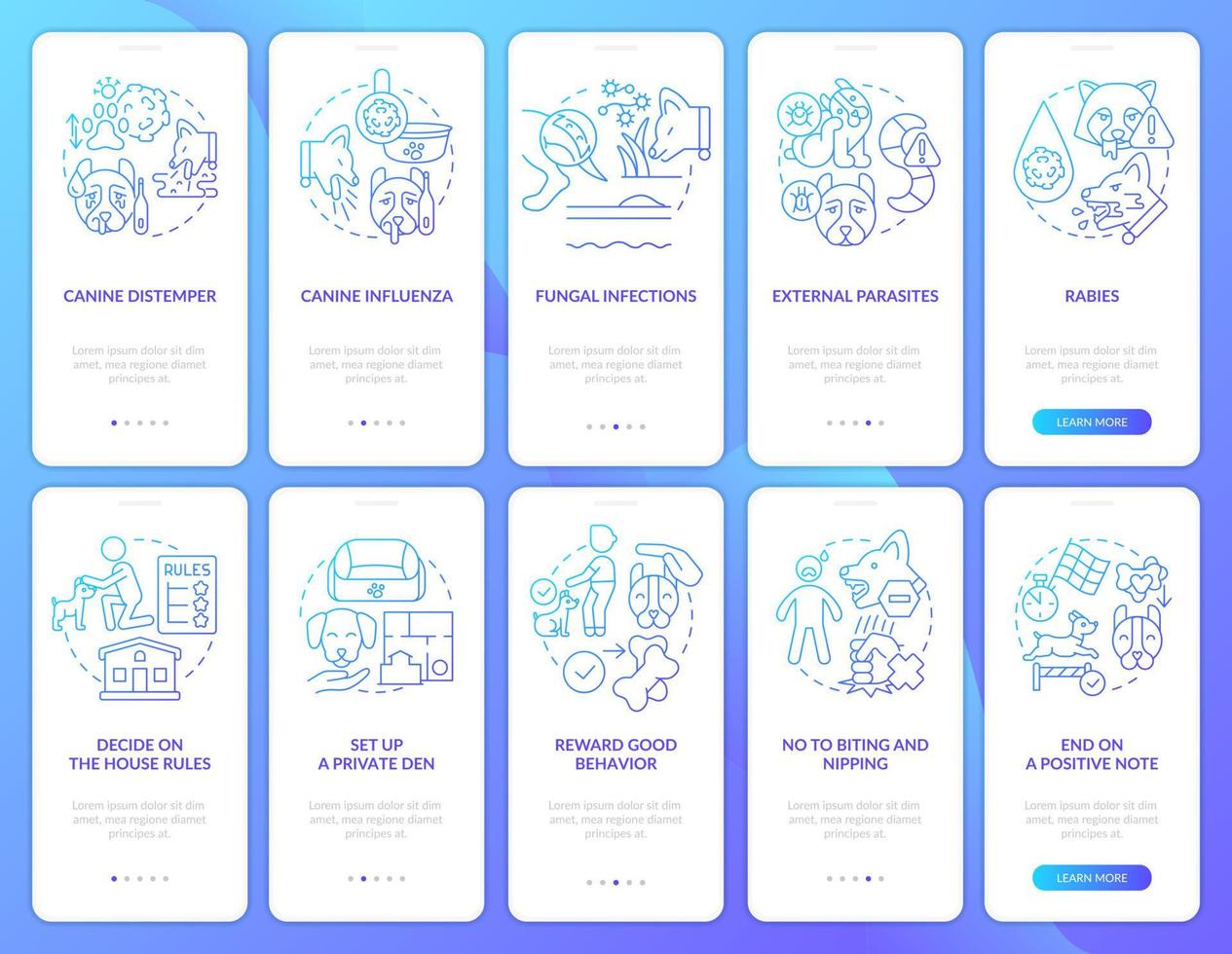 concéntrese en el conjunto de pantalla de la aplicación móvil de incorporación de degradado azul de bienestar del perro. tutorial 5 pasos páginas de instrucciones gráficas con conceptos lineales. interfaz de usuario, ux, plantilla de interfaz gráfica de usuario. Vector Pro