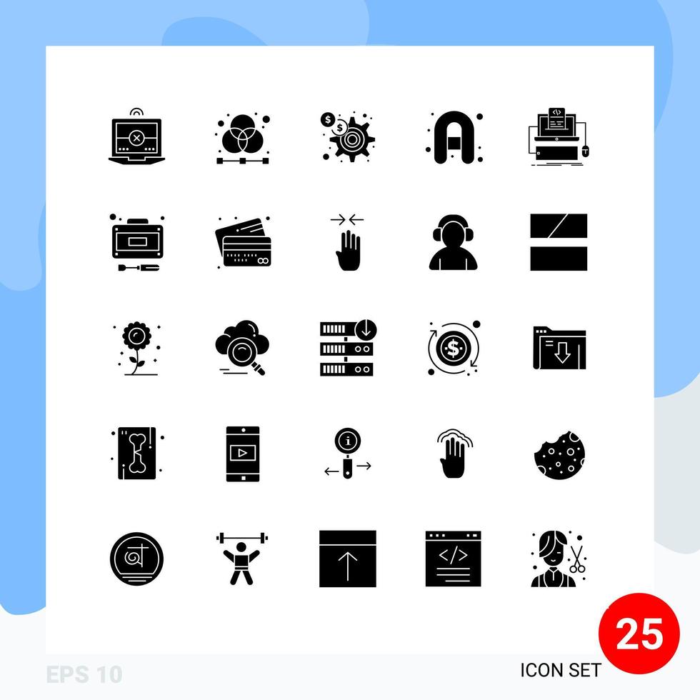 25 glifos sólidos universales establecidos para aplicaciones web y móviles código de computadora viajes en dólares bote inflable elementos de diseño vectorial editables vector