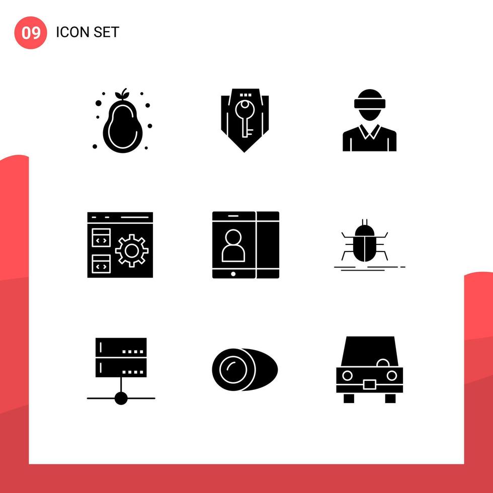 paquete de 9 glifos sólidos creativos de tecnología de aplicación de escudo de codificación de desarrollo elementos de diseño vectorial editables vector
