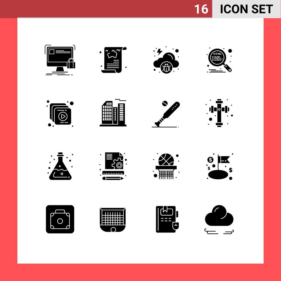 conjunto de pictogramas de 16 glifos sólidos simples de elementos de diseño vectorial editables de virus html de viaje de optimización seo vector