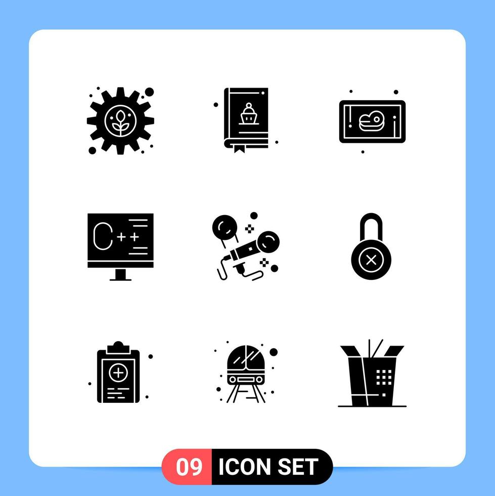 conjunto de glifos sólidos de interfaz móvil de 9 pictogramas de programación de carne de karaoke de fiesta desarrollar elementos de diseño vectorial editables vector