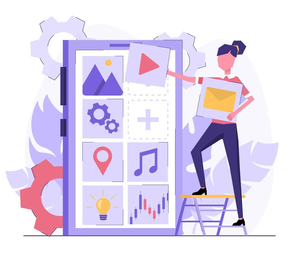 desarrollo de aplicaciones un desarrollador programador crea una aplicación en el teléfono. una mujer pone iconos en la pantalla Vector Pro