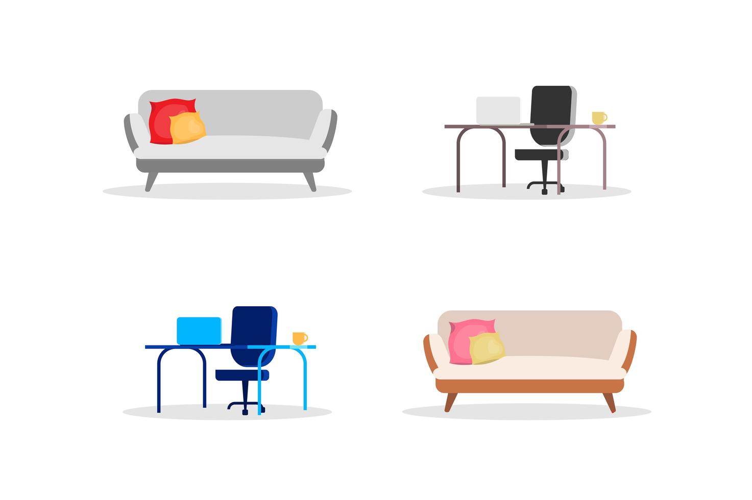 Conjunto de objetos de sofá y mesa de computadora. Vector Pro