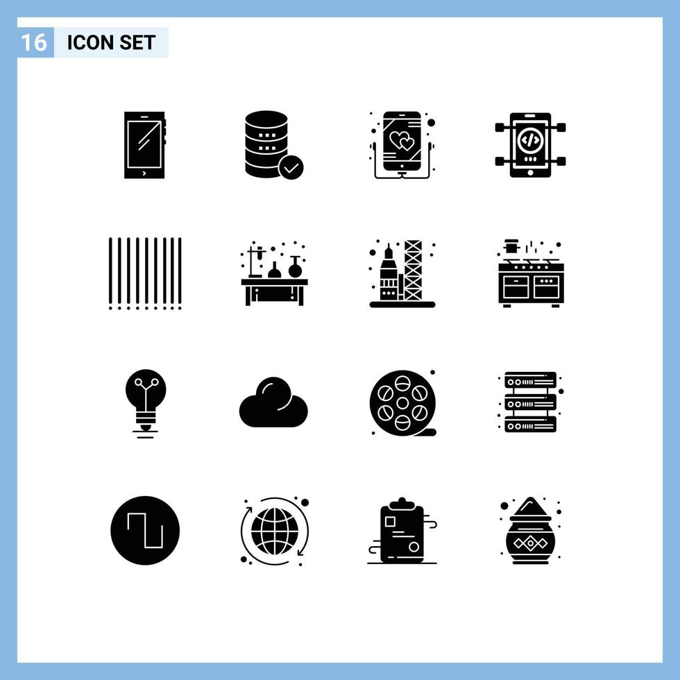 16 glifos sólidos vectoriales temáticos y símbolos editables de desarrollo de código de barras codificación web música elementos de diseño vectorial editables vector