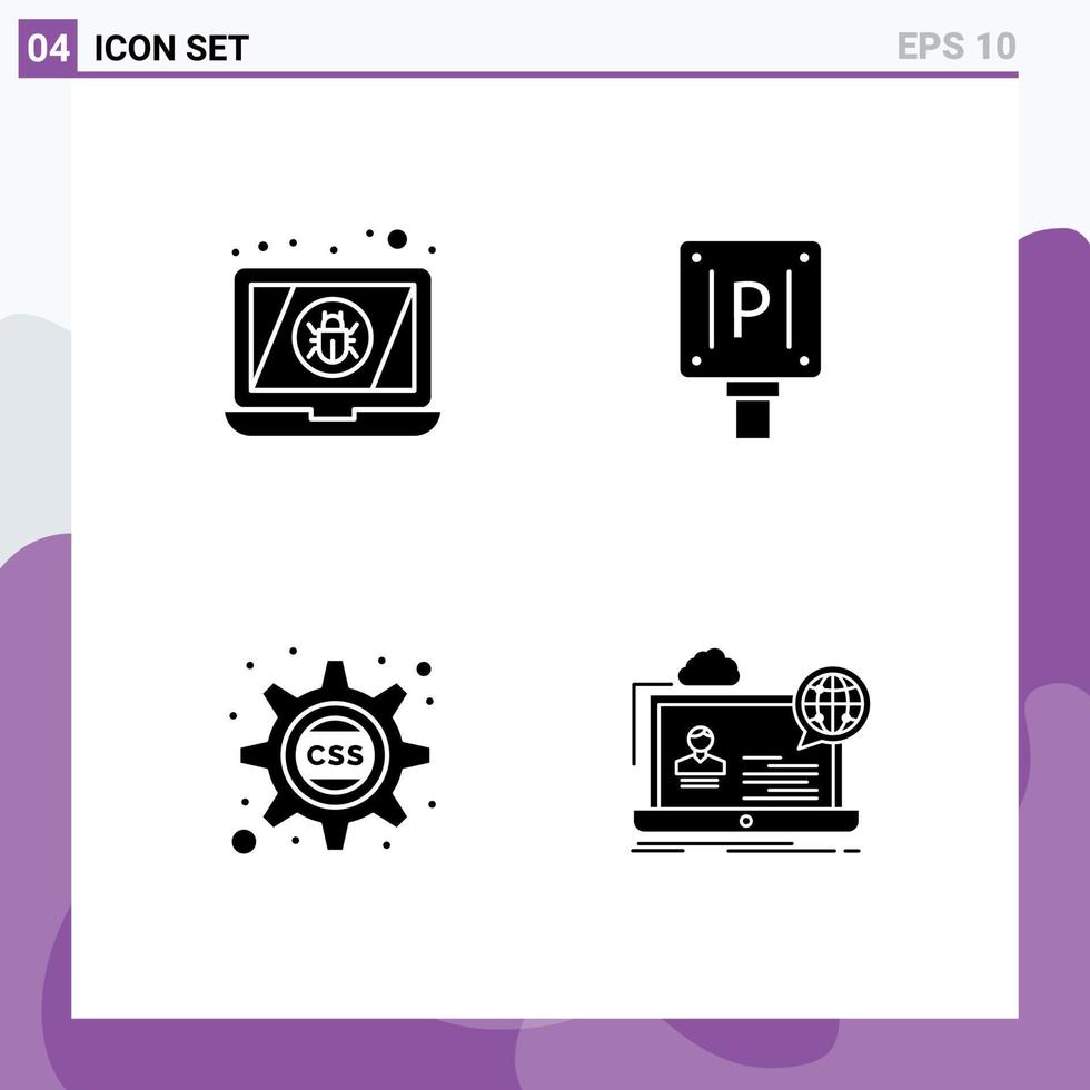 paquete de línea de vector editable de 4 glifos sólidos simples de error cog virus signo css engranaje elementos de diseño de vector editable Vector Gratis