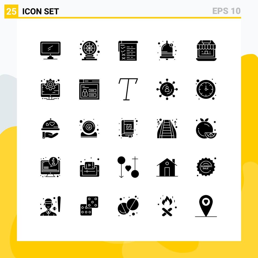 conjunto de pictogramas de 25 glifos sólidos simples de campana de juego de sonido de tienda qa elementos de diseño vectorial editables vector