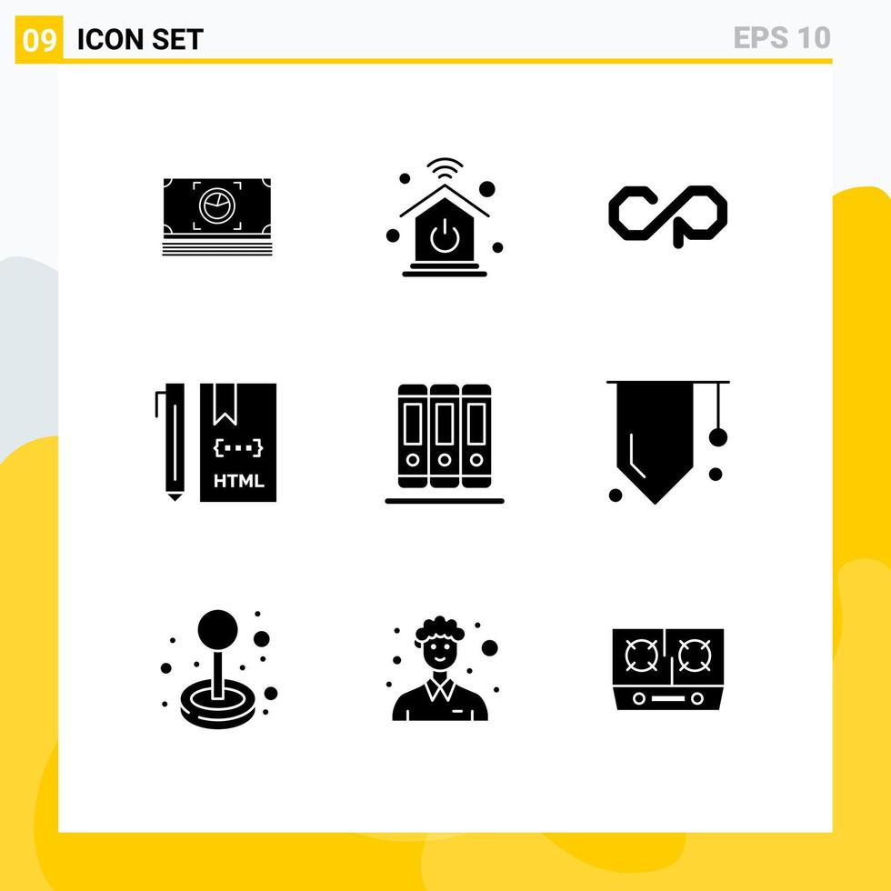 9 signos de glifos sólidos universales símbolos de educación desarrollo de monedas html codificación elementos de diseño vectorial editables vector