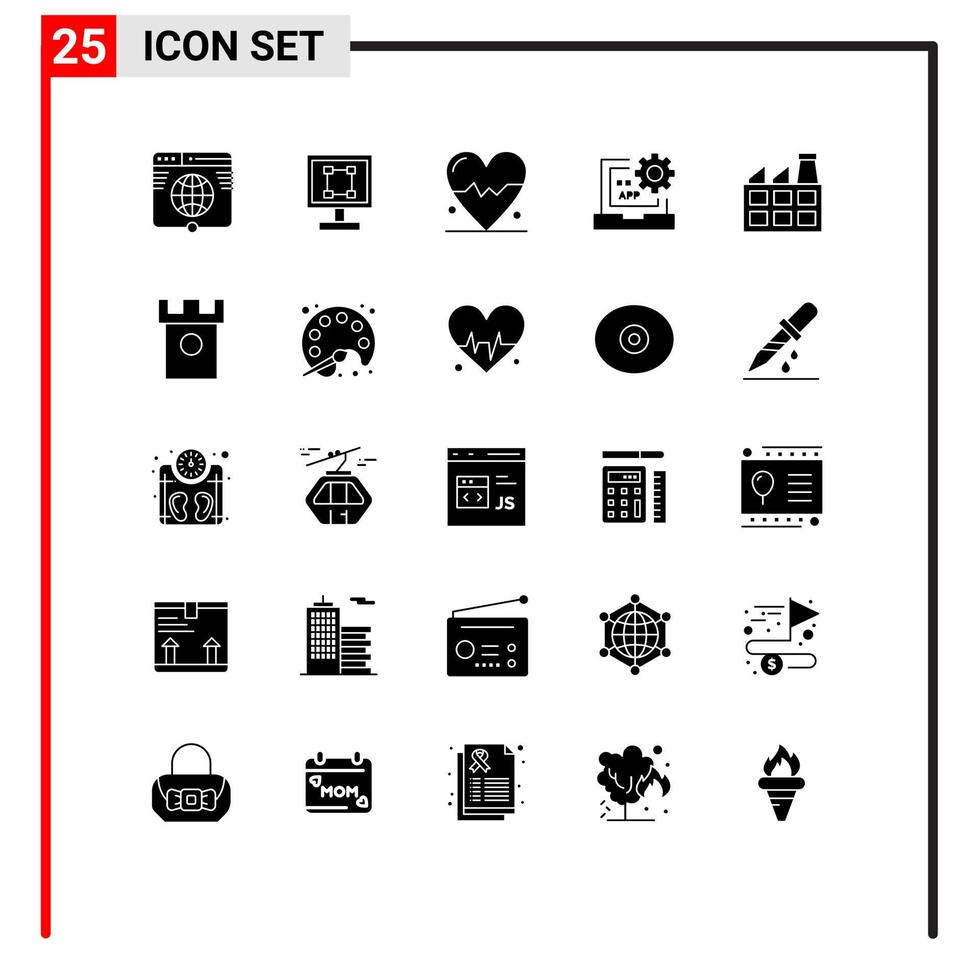 grupo de 25 glifos sólidos modernos establecidos para programar desarrollar elementos de diseño de vectores editables de ciencia de codificación de programas