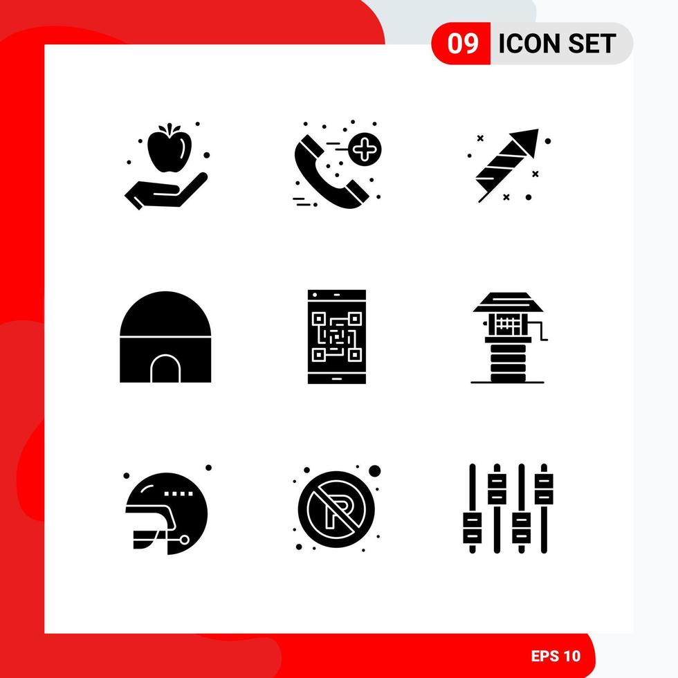 9 conjunto de glifos sólidos universales para aplicaciones web y móviles código qr fuego mezquita edificio histórico elementos de diseño vectorial editables vector