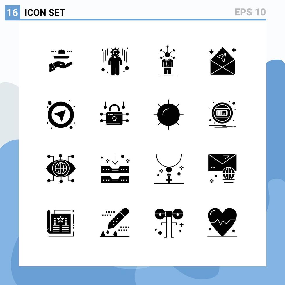 conjunto moderno de 16 glifos y símbolos sólidos, como elementos de diseño vectorial autoeditables de chat de desarrollo de correo de interfaz vector