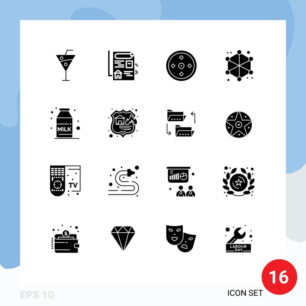16 glifos sólidos universales establecidos para aplicaciones web y móviles leche desayuno deporte datos web elementos de diseño vectorial editables vector