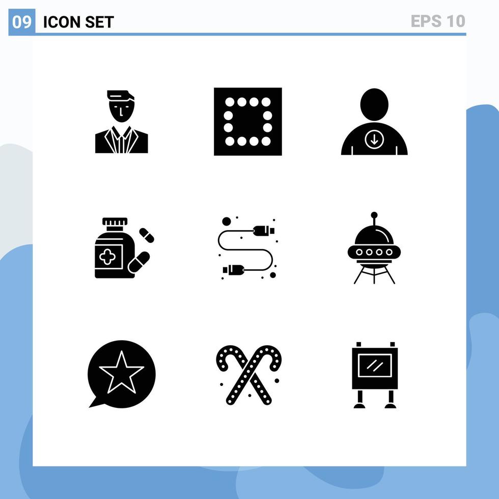 9 conjunto de glifos sólidos universales para aplicaciones web y móviles hardware de nave espacial siguiente elementos de diseño de vectores editables de medicina informática