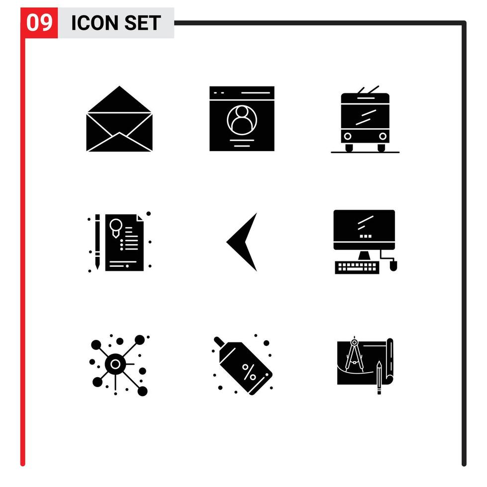 9 conjunto de glifos sólidos universales para aplicaciones web y móviles signo de flecha del carro trasero de la computadora elementos de diseño vectorial editables vector