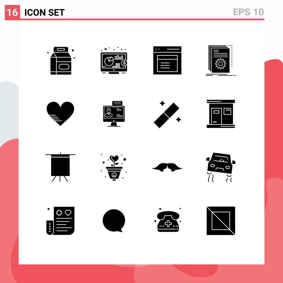 conjunto de 16 paquetes de glifos sólidos comerciales para elementos de diseño vectorial editables de la aplicación de desarrollador de interfaz de programa cardíaco Vector Gratis