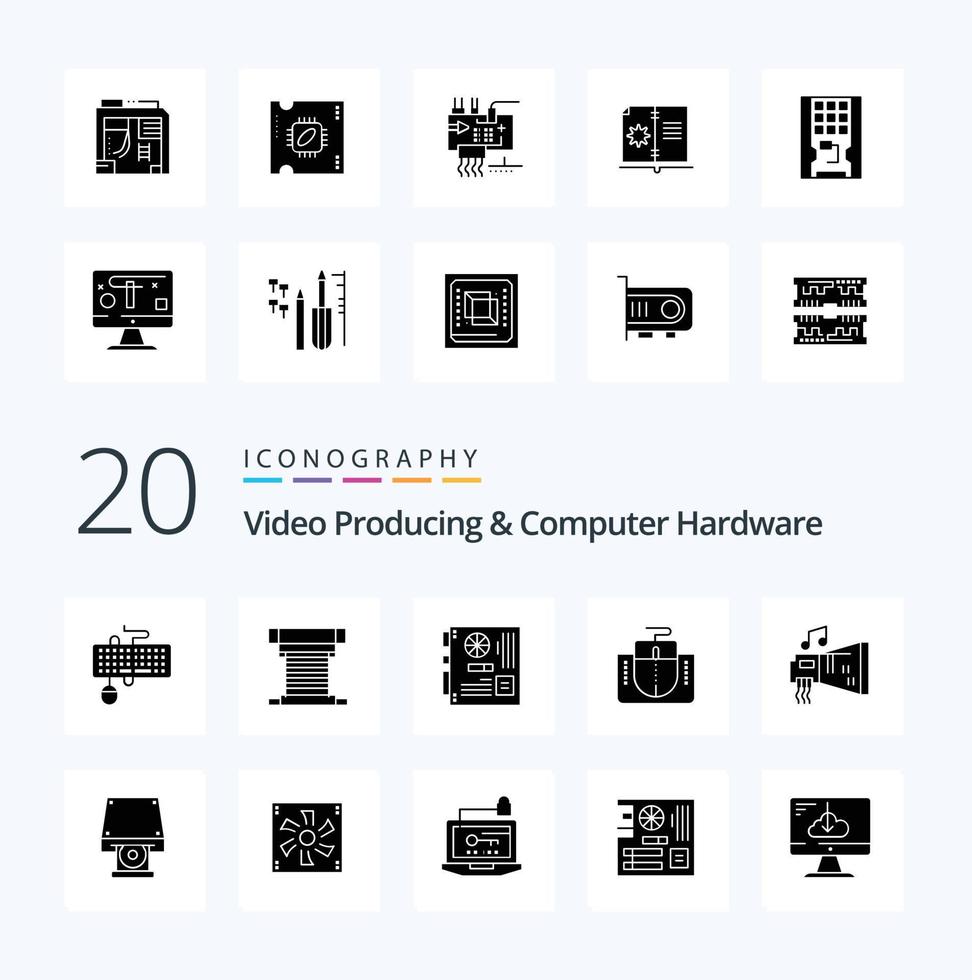 20 producción de video y hardware de computadora paquete de iconos de glifo sólido como interfaz de mouse mouse cpu placa base placa base vector