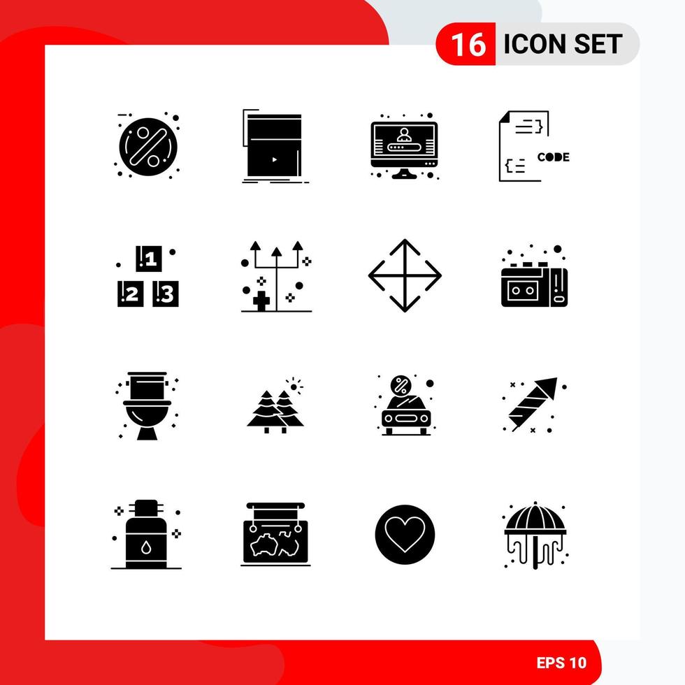 conjunto moderno de 16 glifos y símbolos sólidos, como el sitio web de desarrollo abc, desarrolla elementos de diseño de vectores editables de código
