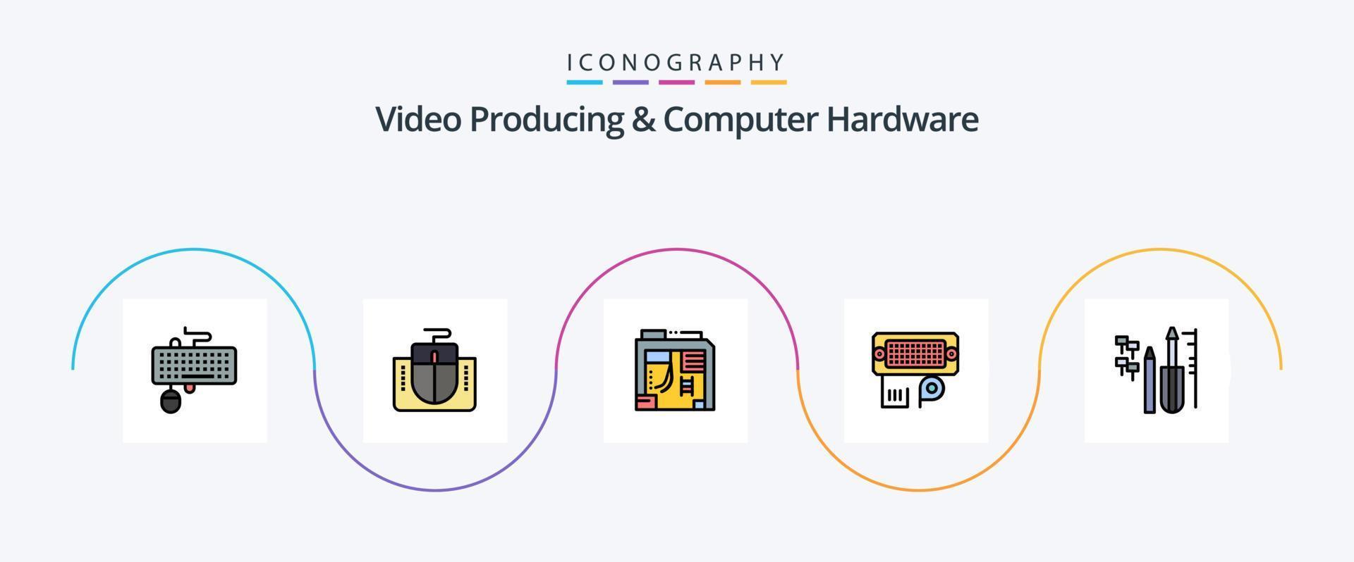 vídeo productor y computadora hardware línea lleno plano 5 5 icono paquete incluso reparar datos. computadora. conexión. computadora vector