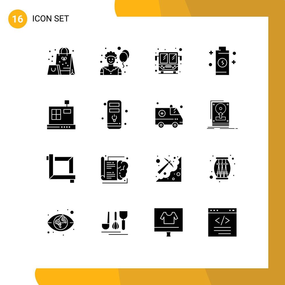 dieciséis universal sólido glifos conjunto para web y móvil aplicaciones computadora comercio público autobús caja de efectivo energía editable vector diseño elementos