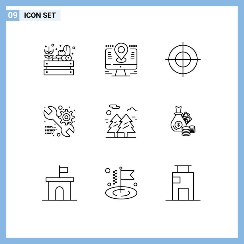 moderno conjunto de 9 9 contornos y símbolos tal como árbol engranaje alfiler web Servicio editable vector diseño elementos