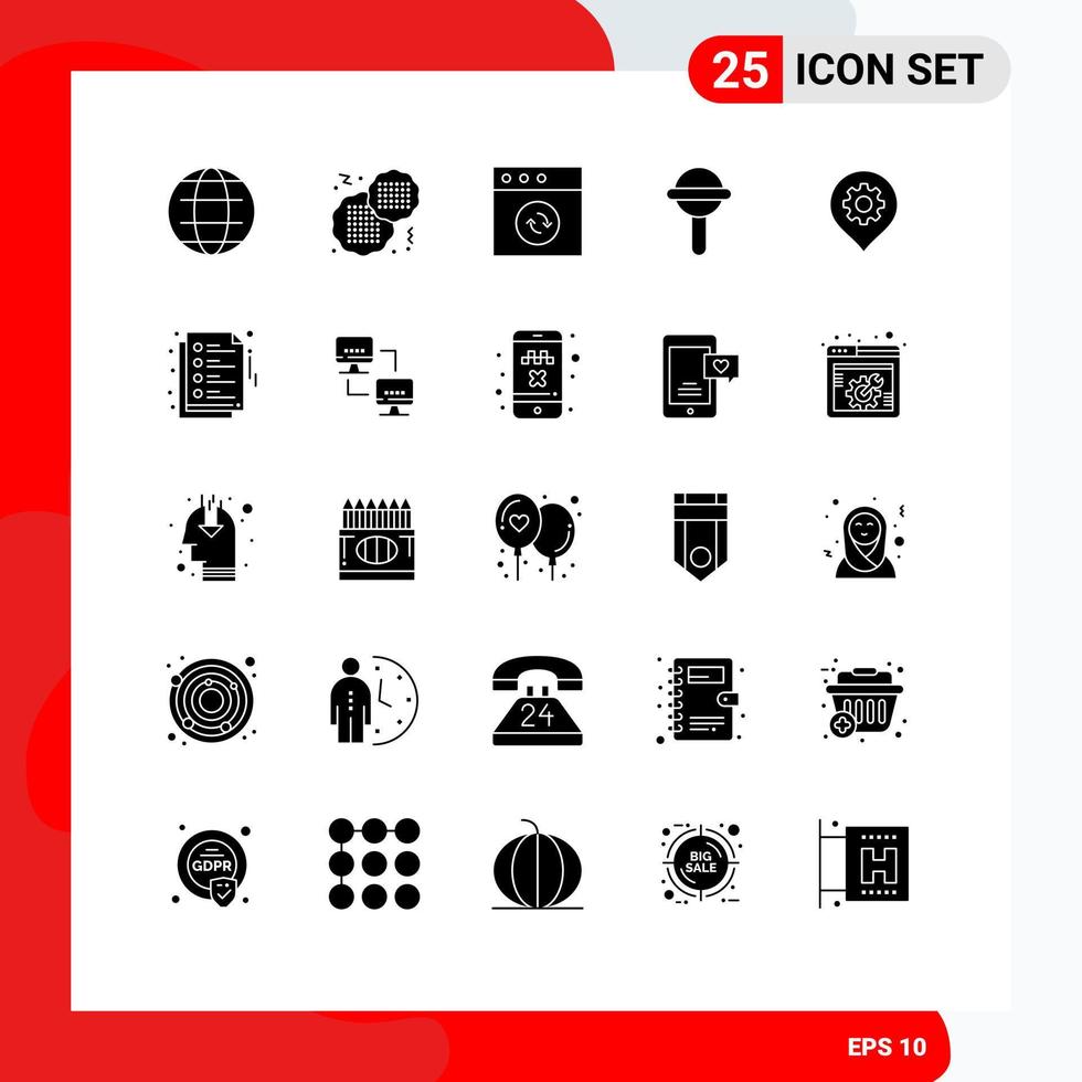 25 sólido glifo concepto para sitios web móvil y aplicaciones mapa ajuste Mac engranaje sonido editable vector diseño elementos