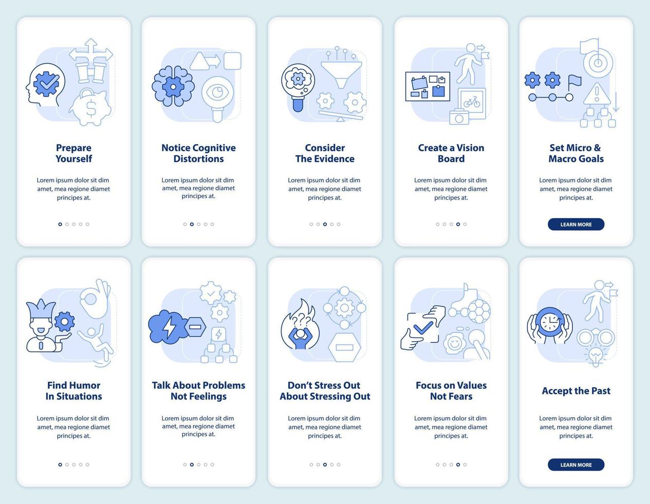 adaptabilidad ligero azul inducción móvil aplicación pantalla colocar. mentalidad recorrido 5 5 pasos editable gráfico instrucciones con lineal conceptos. ui, ux, gui modelo Vector Pro