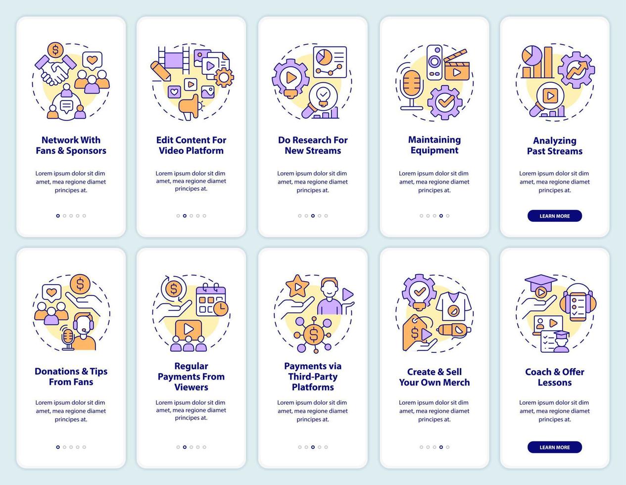 profesional En Vivo transmisión carrera inducción móvil aplicación pantalla colocar. recorrido 5 5 pasos editable gráfico instrucciones con lineal conceptos. ui, ux, gui modelo Vector Pro
