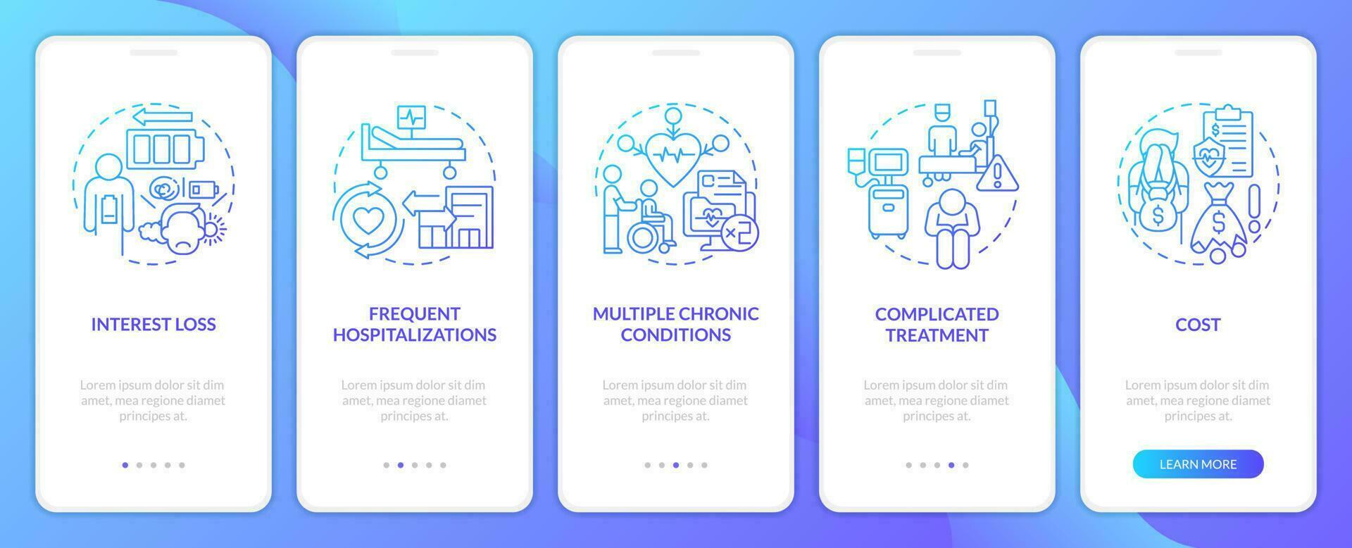crónico cuidado administración retos azul degradado inducción móvil aplicación pantalla. recorrido 5 5 pasos gráfico instrucciones con lineal conceptos. ui, ux, gui modelo Pro Vector y Pro SVG