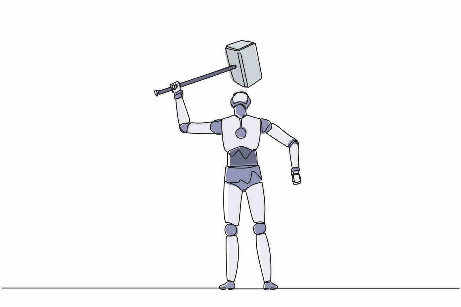 robot de dibujo de una sola línea de pie y levantando un gran martillo. desarrollo tecnológico futuro. proceso de aprendizaje automático de inteligencia artificial. ilustración de vector gráfico de diseño de línea continua Vector Pro