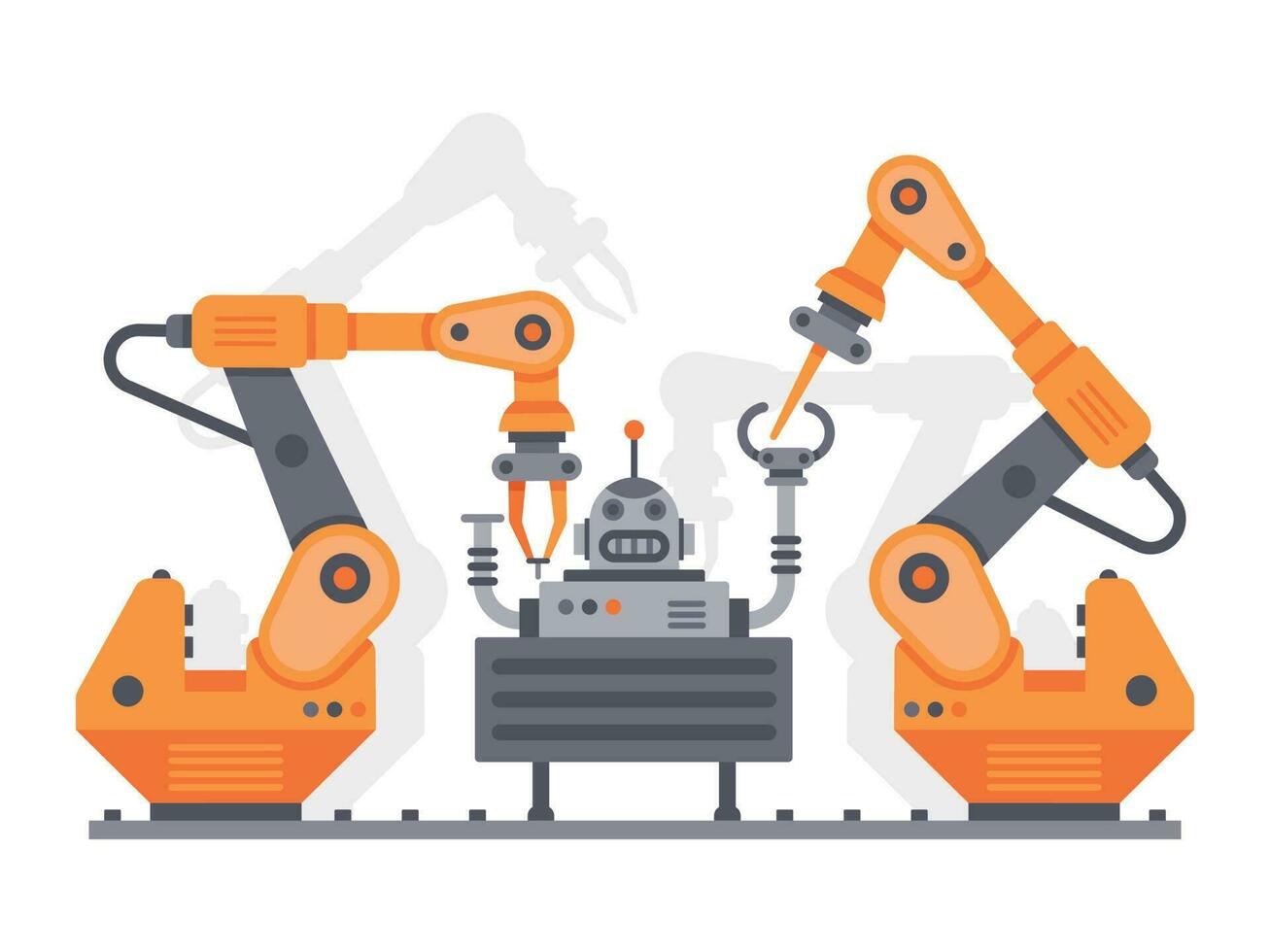 plano auto robots fábrica. electrónico montaje de larva del moscardón o robot vector ilustración Vector Pro
