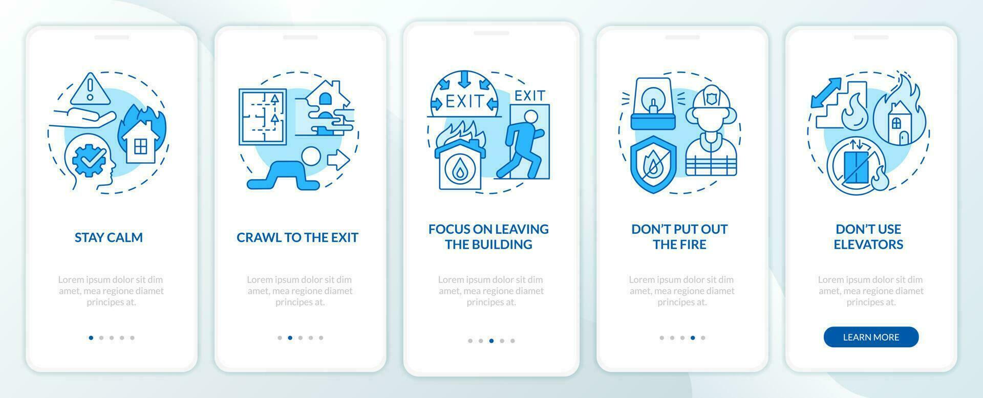 escapar casa desde fuego azul inducción móvil aplicación pantalla. recorrido 5 5 pasos editable gráfico instrucciones con lineal conceptos. ui, ux, gui modelo Pro Vector y Pro SVG