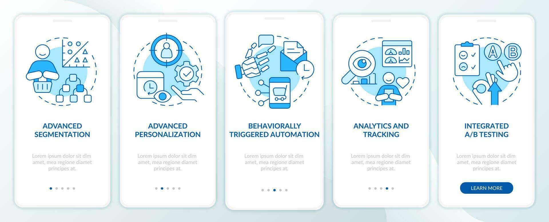 cliente compromiso plataforma caracteristicas azul inducción móvil aplicación pantalla. recorrido 5 5 pasos editable instrucciones con lineal conceptos. ui, ux, gui modelo Pro Vector y Pro SVG