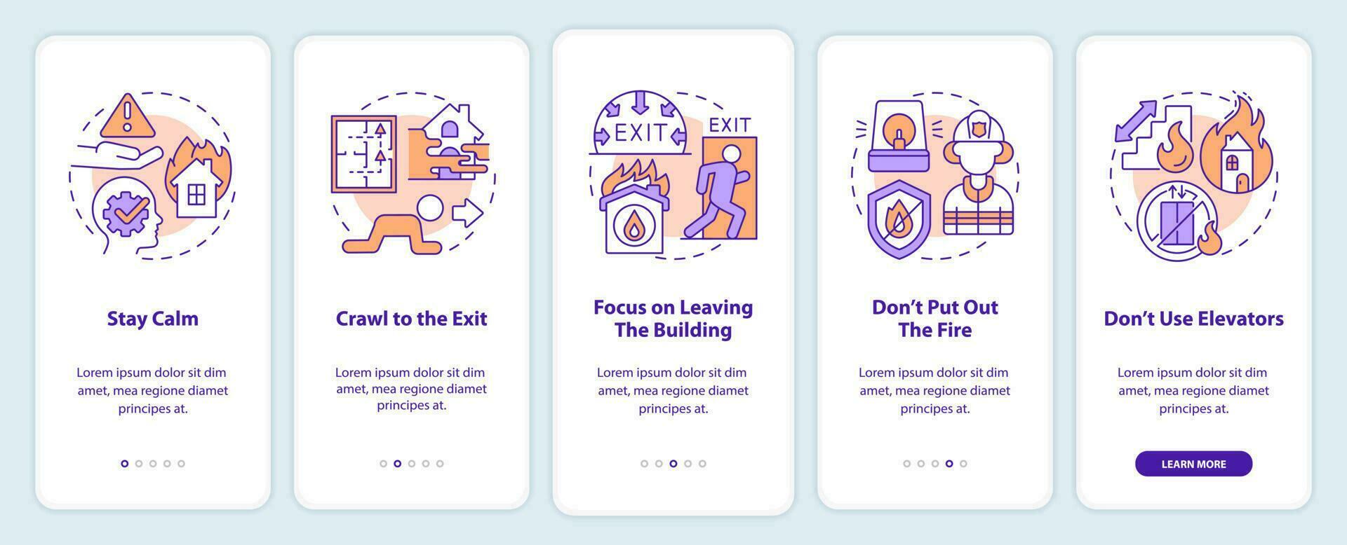 evacuación desde ardiente edificio inducción móvil aplicación pantalla. recorrido 5 5 pasos editable gráfico instrucciones con lineal conceptos. ui, ux, gui modelo Vector Pro
