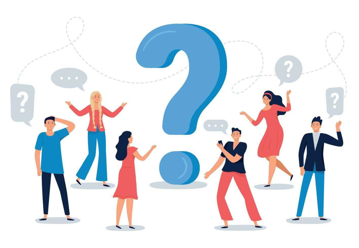 personas pedir pregunta. confuso persona preguntando preguntas, multitud hallazgo respuestas y pregunta firmar vector ilustración. colectivo idea genial, mutuo asistencia concepto. público problema solución Servicio Vector Pro