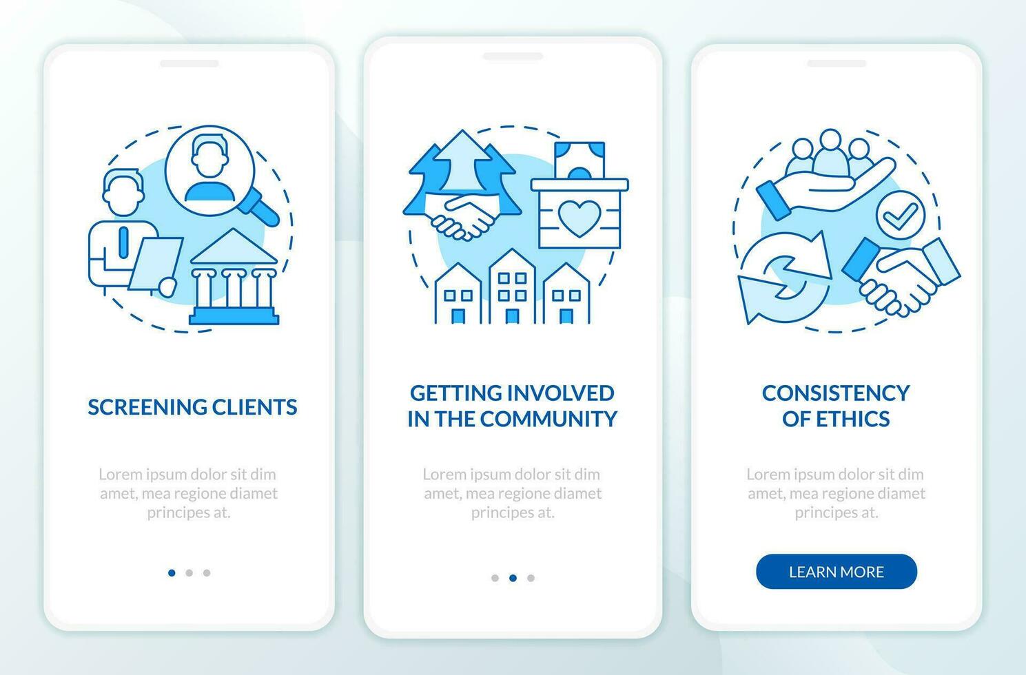 ético practicas en bancos azul inducción móvil aplicación pantalla. recorrido 3 pasos editable gráfico instrucciones con lineal conceptos. ui, ux, gui modelo Pro Vector y Pro SVG