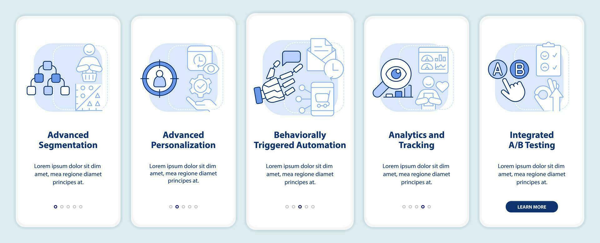 cliente compromiso plataforma caracteristicas ligero azul inducción móvil aplicación pantalla. recorrido 5 5 pasos editable instrucciones con lineal conceptos. ui, ux, gui modelo Vector Pro