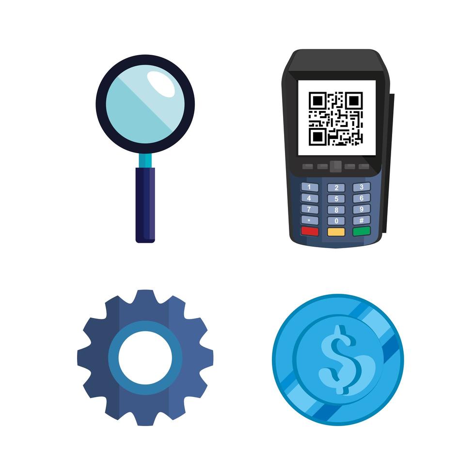 datáfono con escaneo de código qr y conjunto de iconos vector