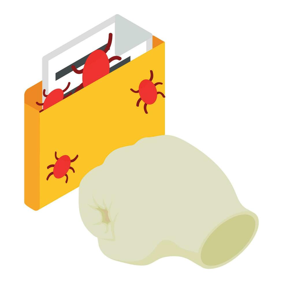 web hackear icono isométrica vector. error ataque en documento y humano mano icono Vector Pro