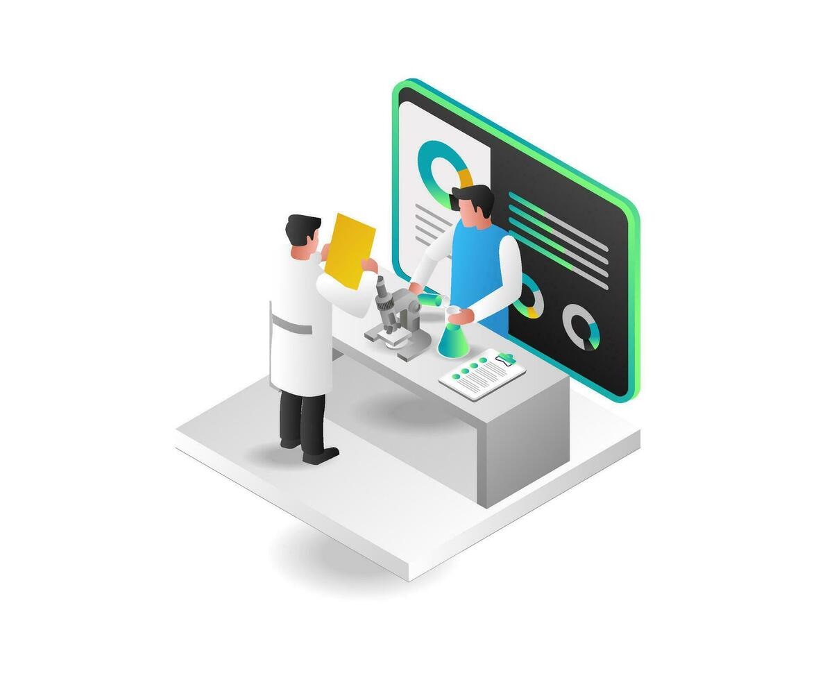 isométrica concepto ilustración de un científico haciendo un experimentar a encontrar datos Vector Pro