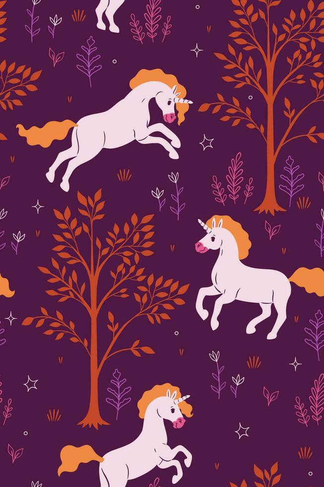 sin costura modelo con unicornios en un mágico bosque. vector gráficos. Vector Pro