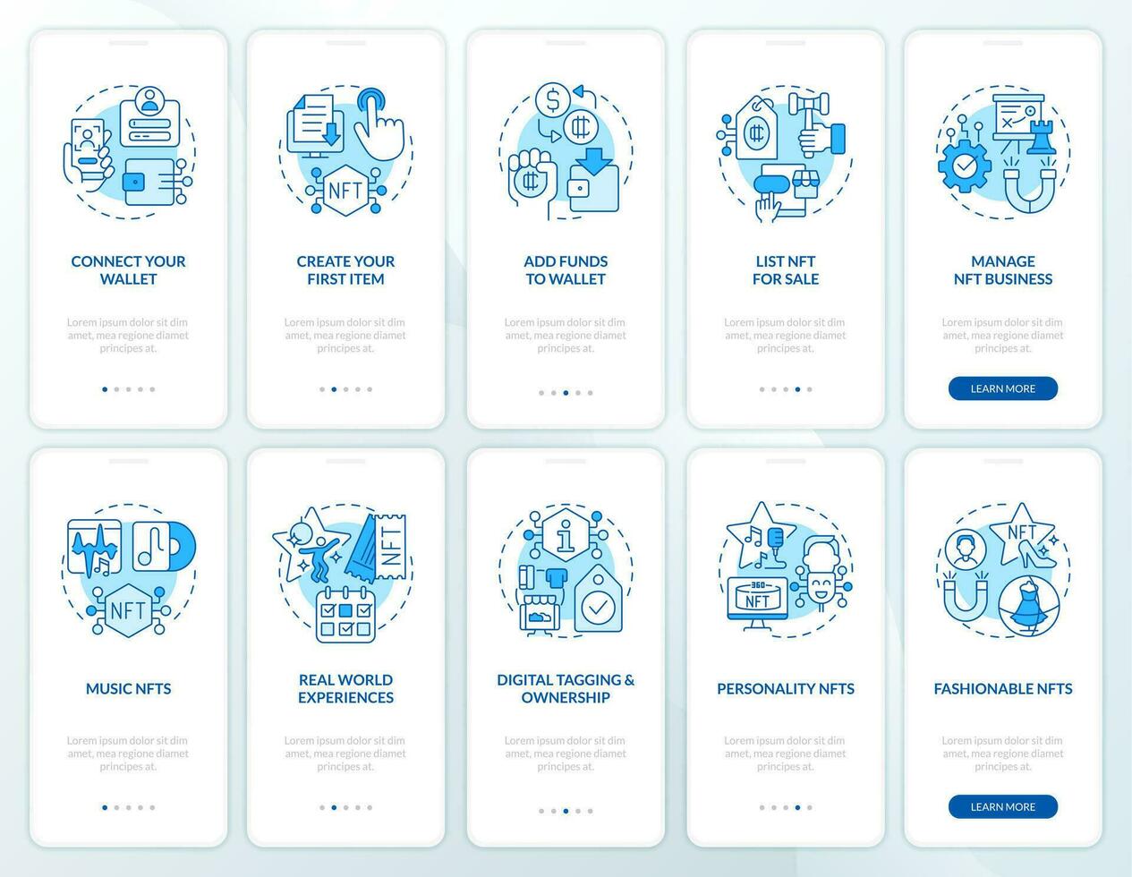 nfts acuñando y tendencias azul inducción móvil aplicación pantalla colocar. recorrido 5 5 pasos editable gráfico instrucciones con lineal conceptos. ui, ux, gui modelo Vector Pro