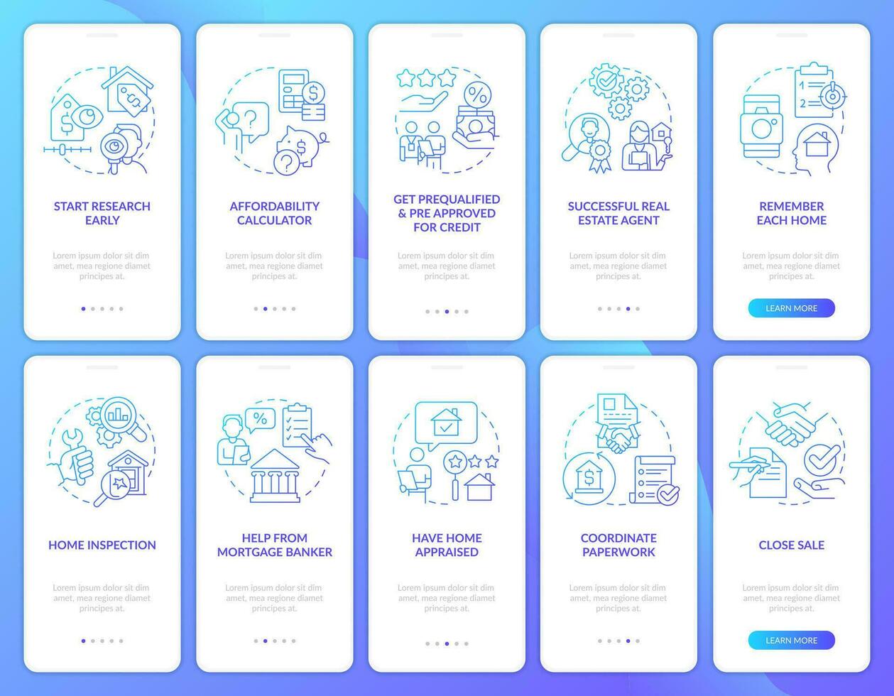 comprando hogar azul degradado inducción móvil aplicación pantalla colocar. nuevo propiedad guía recorrido 5 5 pasos gráfico instrucciones con lineal conceptos. ui, ux, gui modelo Vector Pro