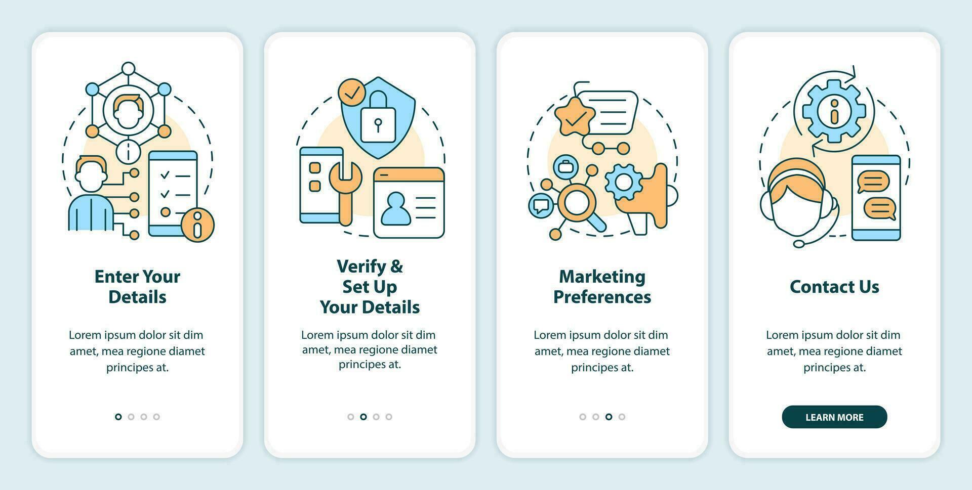 en línea bancario registro guía inducción móvil aplicación pantalla. recorrido 4 4 pasos editable gráfico instrucciones con lineal conceptos. ui, ux, gui modelo Vector Pro