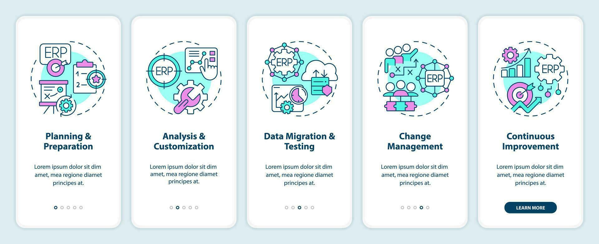 2d íconos representando empresa recurso planificación móvil aplicación pantalla colocar. recorrido 5 5 pasos gráfico instrucciones con lineal íconos concepto, ui, ux, gui modelo. Vector Pro