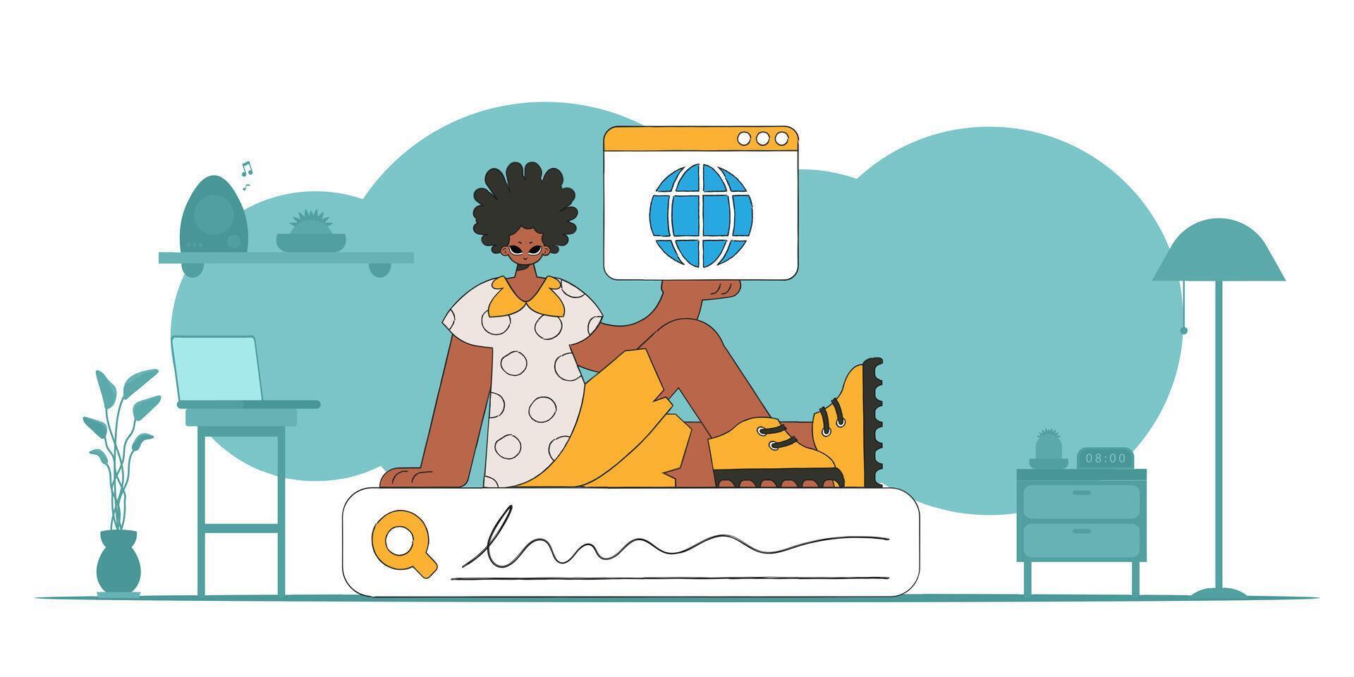 el concepto de buscando para información. un hombre se sienta en un buscar bar y sostiene un web navegador en su manos. lineal retro estilo personaje. Vector Pro